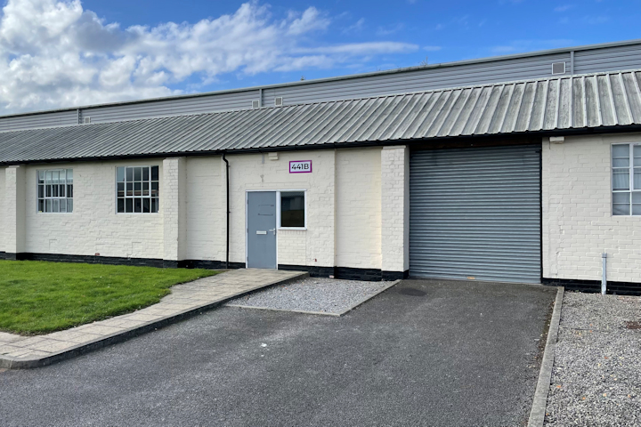 Modern industrial unit with roller shutter door.
